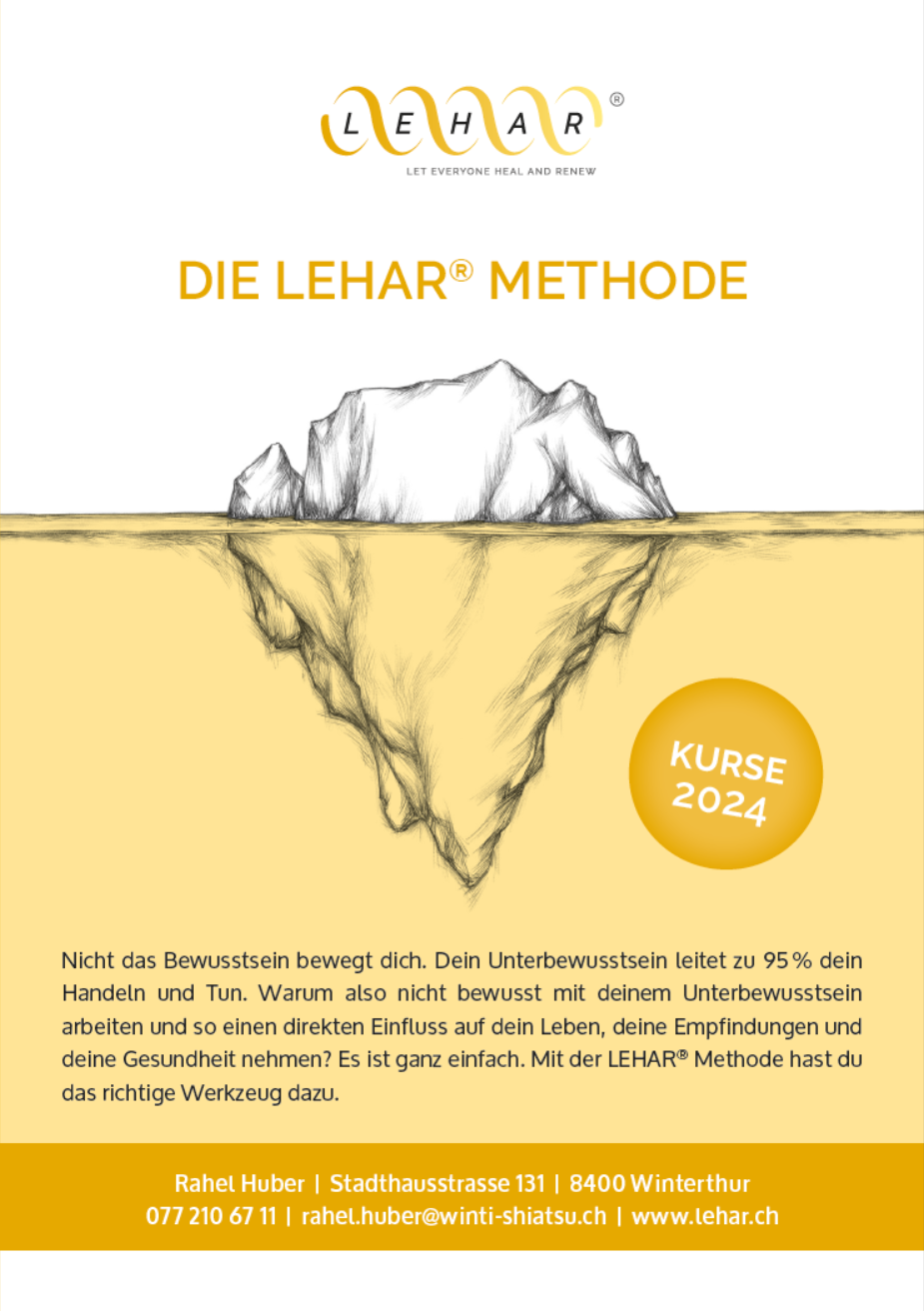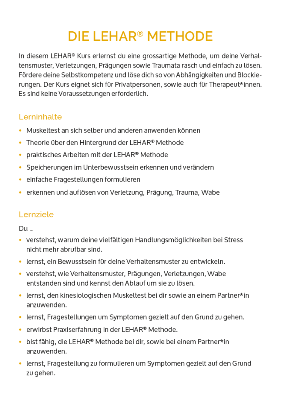 Mit dem LEHAR® Vertiefungskurs erlernst du weitere Möglichkeiten wie du rasch und effizient Zugang zu deinem Unterbewusstsein erlangst. Damit kannst du Prägungen und Verhaltensweisen noch besser erkennen und auflösen. Dieser Vertiefungskurs widmet sich ganz besonders den unbewusst erfahrenen, und deshalb verdrängten Verletzungen, welche mein Verhalten und Empfinden dennoch nachhaltig beeinflussen und mich hindern, ganz bei mir zu sein.